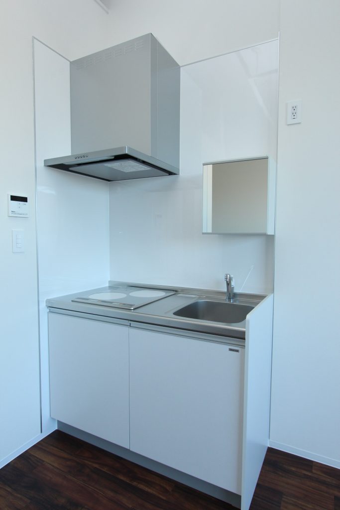 生活面の設備は、浴槽がなくシャワーブース設置、トイレ、キッチン(2口IH)、室内洗濯機置場、エアコン(18畳用)、玄関脇に稼働棚があります。