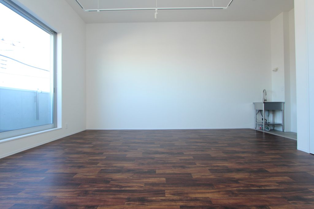 正方形に近い居室となっていますので、お部屋の中央に製作用のテーブルを置く事が多い工房の利用を考えていらっしゃる方でも、レイアウトを考えやすくなっています。
