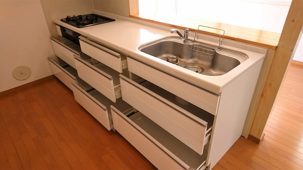 対面式のシステムキッチンは3口コンロでグリル付き。流しも大きく、使い勝手の良いキッチンです。