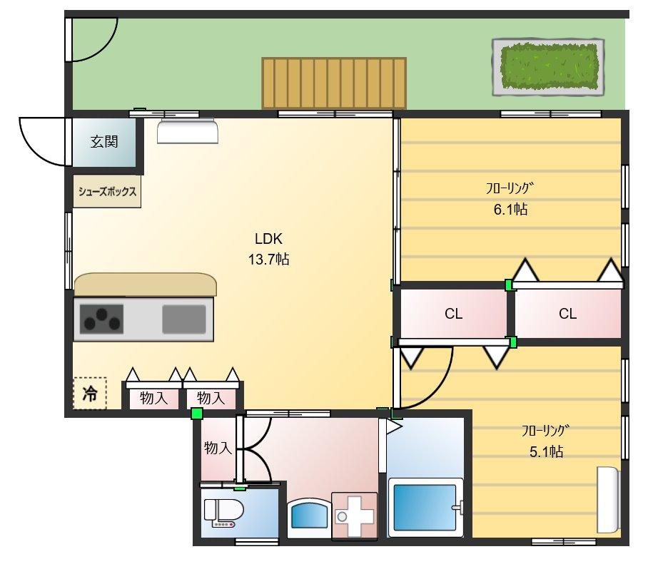 | 設備等 | バストイレ別、エアコン、温水洗浄便座 システムキッチン、ガスコンロ(3口) 洗濯機室内置き、追い焚き、専用庭 |