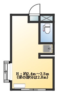 シンク、トイレ、エアコンなどの設備はそろっており、天井高は約2.4m~2.5mの開放感のあるコンパクトなアトリエ。
